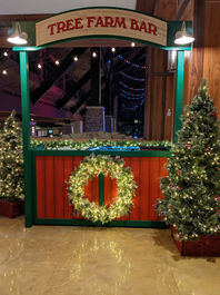 This Christmas Tree Farm Bar had a photo op next to it which was different at both locations. I setup all the trees as well as set all the props for the shelves in the set. I built the centerpiece for the photo-op that has the shelf, to do this I used several cutoffs from wreaths and garlands as well as other miscellaneous Christmas props and toys to create a picture perfect moment. For the props I zip-tied them together with mountable ties so I could properly and safely secure them to the wood. For the bucket I drilled a hole inside and mounted it to the shelf that way and filled the inside with props that were all secured to each other to hide the attachment methods for best show quality possible. When linking the trees together I wired them through the branches so that all the running cables could be hidden from guest view and blend into the foliage well. I did a lot of the construction of the actual buildings by using standardized attachment methods used when framing a wall together for the safest and most secure build. I also did all the lighting fixtures and wired them as I did the trees by hiding them from view to create a smooth and seamless appearance.